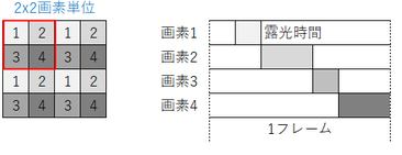 2x2の4つの画素単位で個別に露光時間とシャタータイミングの設定可能。